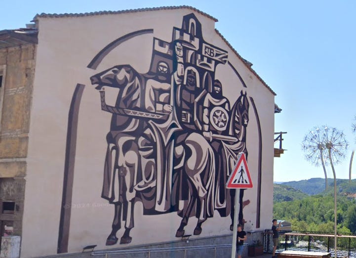 In the photo I see a mural with what looks like Knights holding a shield with a cross on it, so maybe it’s a mural honoring the Crusades, and maybe it’s a sign that the trail for the Crusades went through the town during the Middle Ages. I searched for Crusades that went through Bulgaria and found this map: