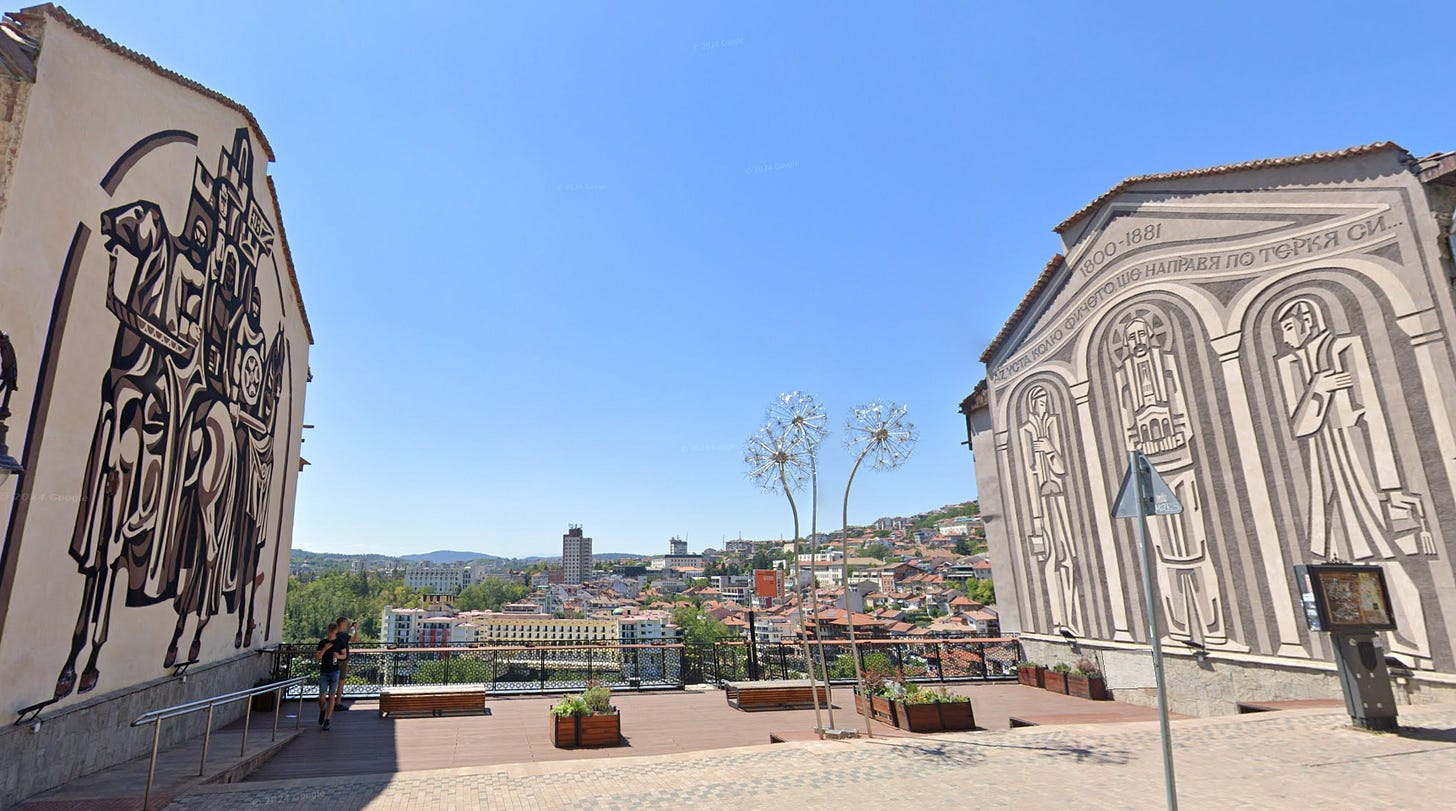 This view has an Eastern European feel to it, and the building on the far right appears to be some kind of institution displaying the Bulgarian flag vertically. A search for similar structures revealed it to be the the Boris Denev State Art Gallery:
