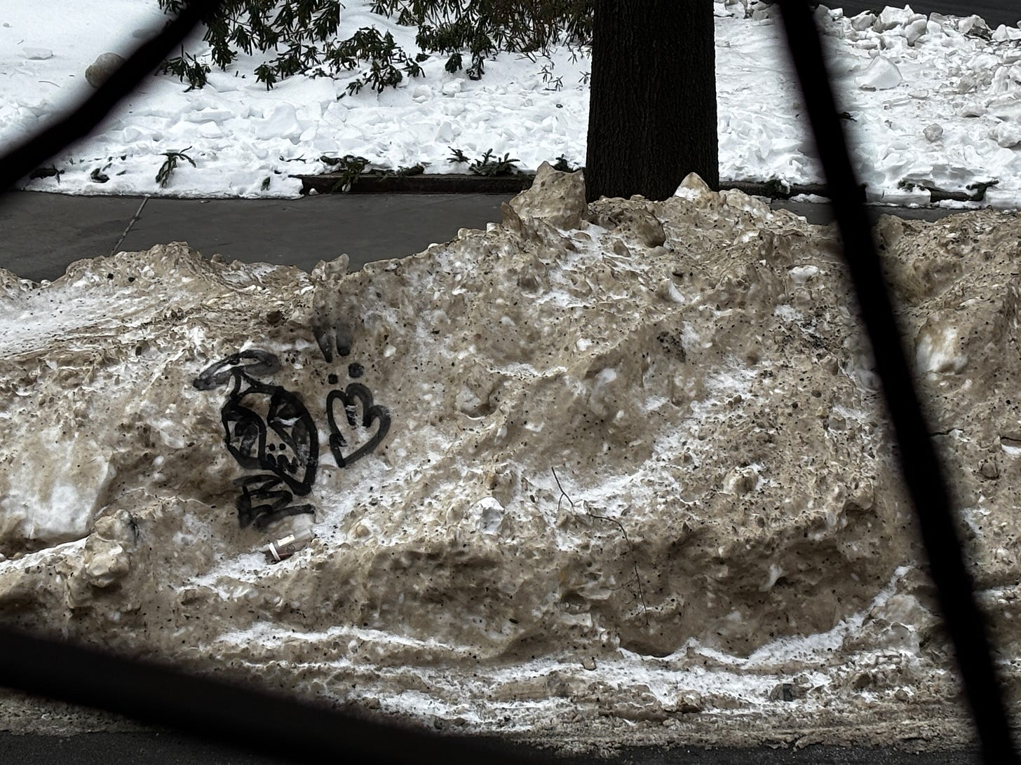 The Friday before the big winter storm, Con Edison frantically trenched the end of my street so they could eventually install a large pipe of some sort, covering it with steel plates at the end of the day. The following Tuesday they came back with a front loader and piled all the snow covering the trench into an urban iceberg across the street from me. Then, two days later a graffiti artist came along and left us a very strange piece of artwork on the iceberg: