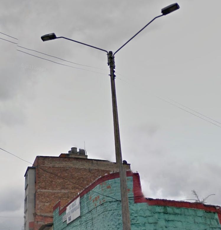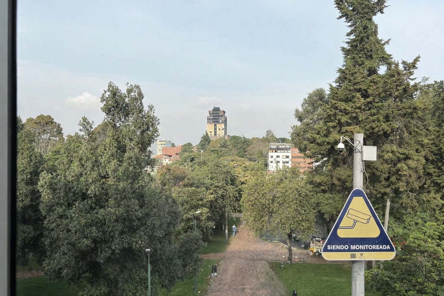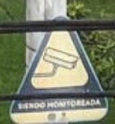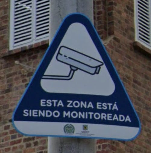 The visible words “siendo monitoreada” form the bottom part of the phrase “esta zona está siendo monitoreada” that appears on various signs alerting folks in the Hispanophone world that they are on camera. The vibe seemed more like Latin America than Europe, and at first I thought maybe Mexico City or Buenos Aires. I looked for triangular signs like this in Latin America and seemed to be getting a lot of hits in [country and city redacted], such as this one outside a church: