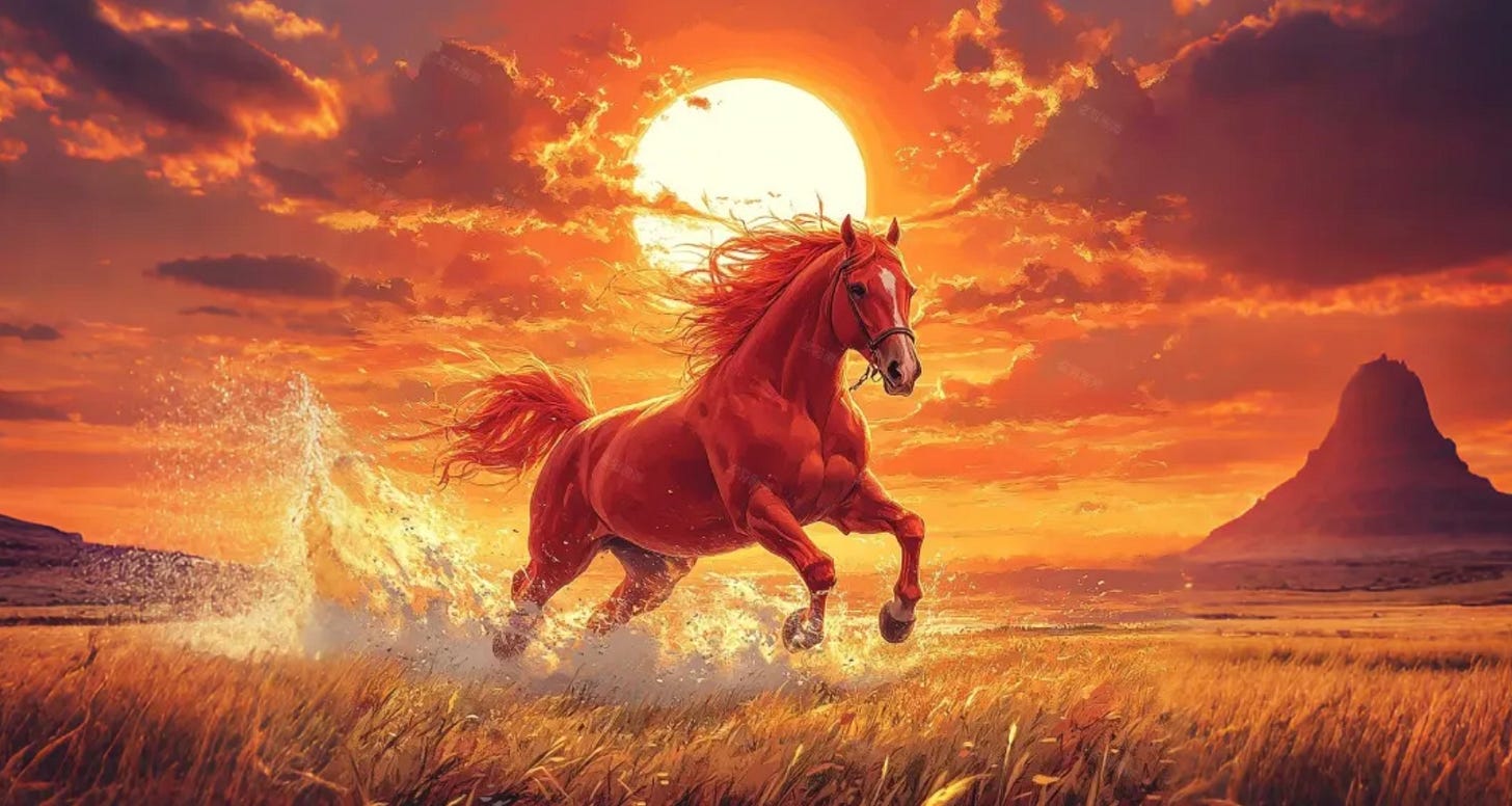 The year of the fire horse in the Chinese zodiac commences on Feb. 17, the same time as the annual solar eclipse in Aquarius. This is the first time this particular combination of Chinese zodiac sign and element has rolled around in 60 years, and the hype is real. … According to Chinese spiritual author Helen Ye Plehn, the horse is “known for freedom, enthusiasm, intelligence, and a strong drive for movement and progress.” … Fire, meanwhile, represents visibility, passion, momentum, and transformation.