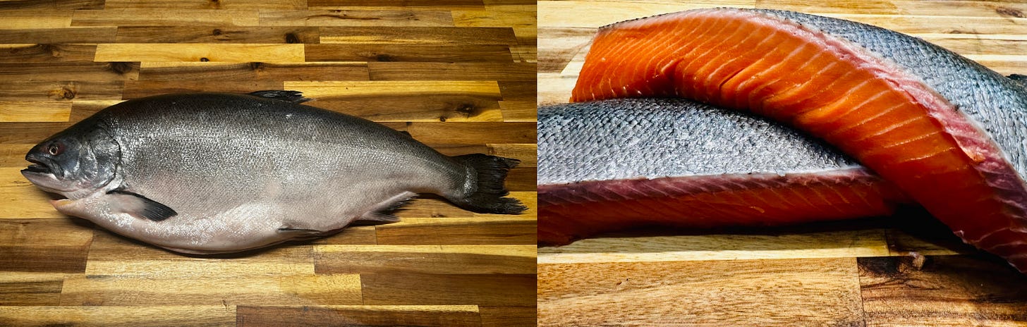 Honoring memory, I went back even further to the first cookbook I owned, Elizabeth David’s French Provincial Cooking, where I found a recipe for cold salmon loin with Montpelier butter, a rich puree of butter, tarragon, parsley, chervil, chives, shallots, cornichon, anchovies, capers, garlic, egg yolks, olive oil, and vinegar. The Chop Shop had a whole Ōra King Salmon (“the Wagyu beef of fish”) which I could not resist buying and breaking down with the help of many YouTube videos and a sharp knife: