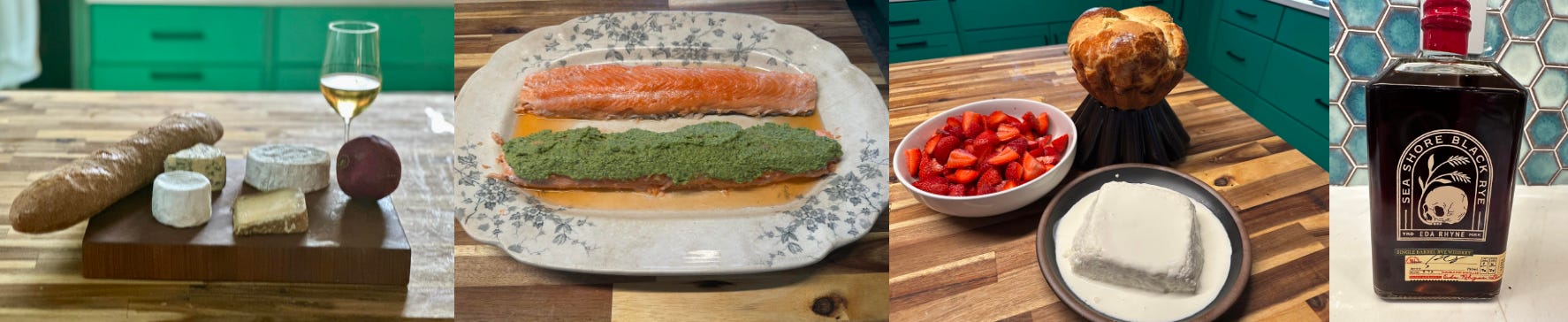 Meanwhile, daughter no. 1 was busy researching brioche in The Breadbaker’s Apprentice. There were three versions — for the rich, the middle class, and the poor — mostly distinguished by the amount of butter they used. So of course we chose the rich, although she and her husband later did some research to find out that Chardin was a champion of the middle class. Apparently, still lives were shunned by the hoity-toity in favor of grand historical paintings. We started out the meal with a selection of French cheeses, followed by the divine combination of cold poached salmon loin and Montpelier butter, finishing with the fromage à la crème, strawberries, and brioche: